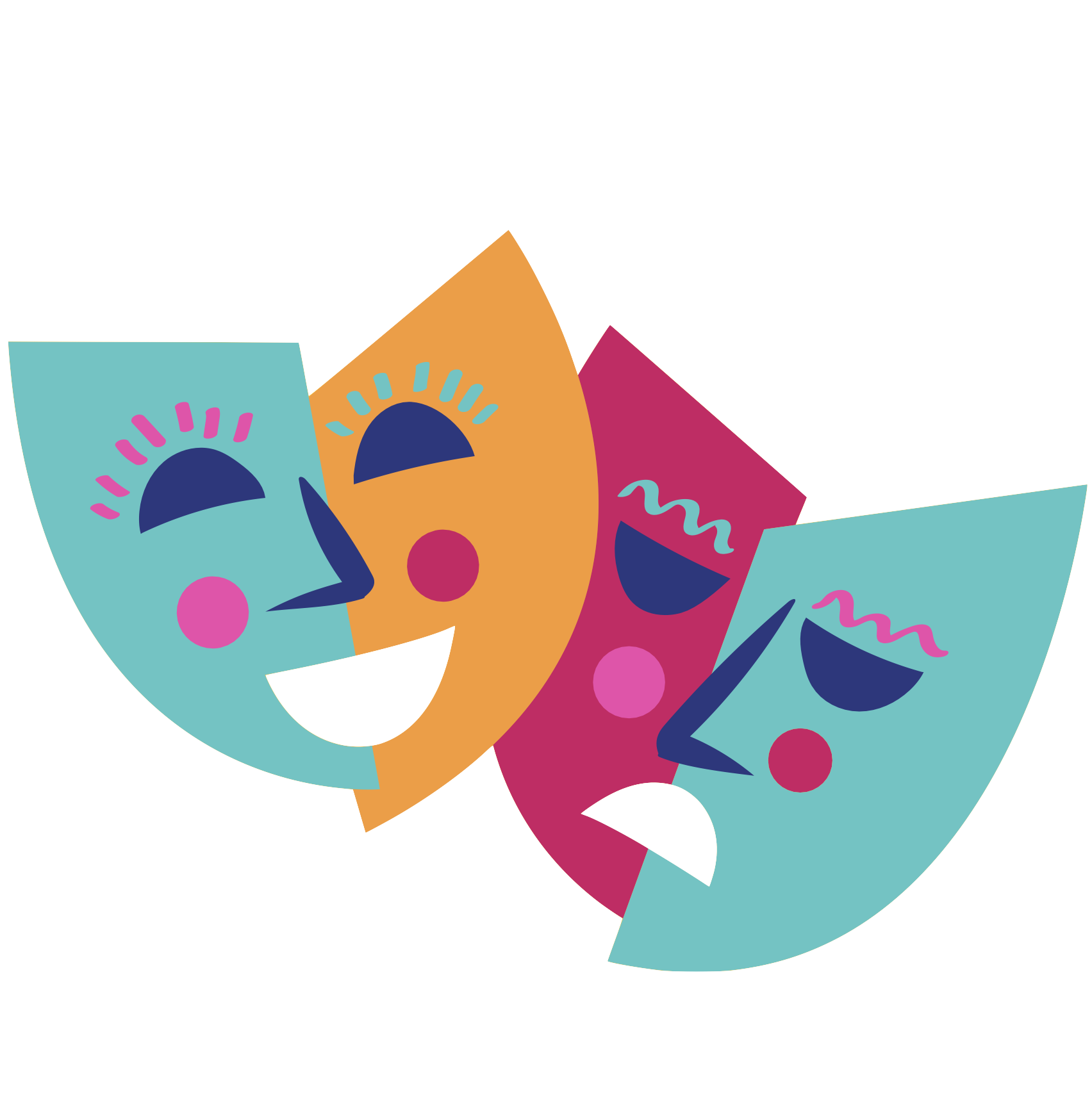 Conceptual theatrical illustration featuring overlapping classical comedy and tragedy masks